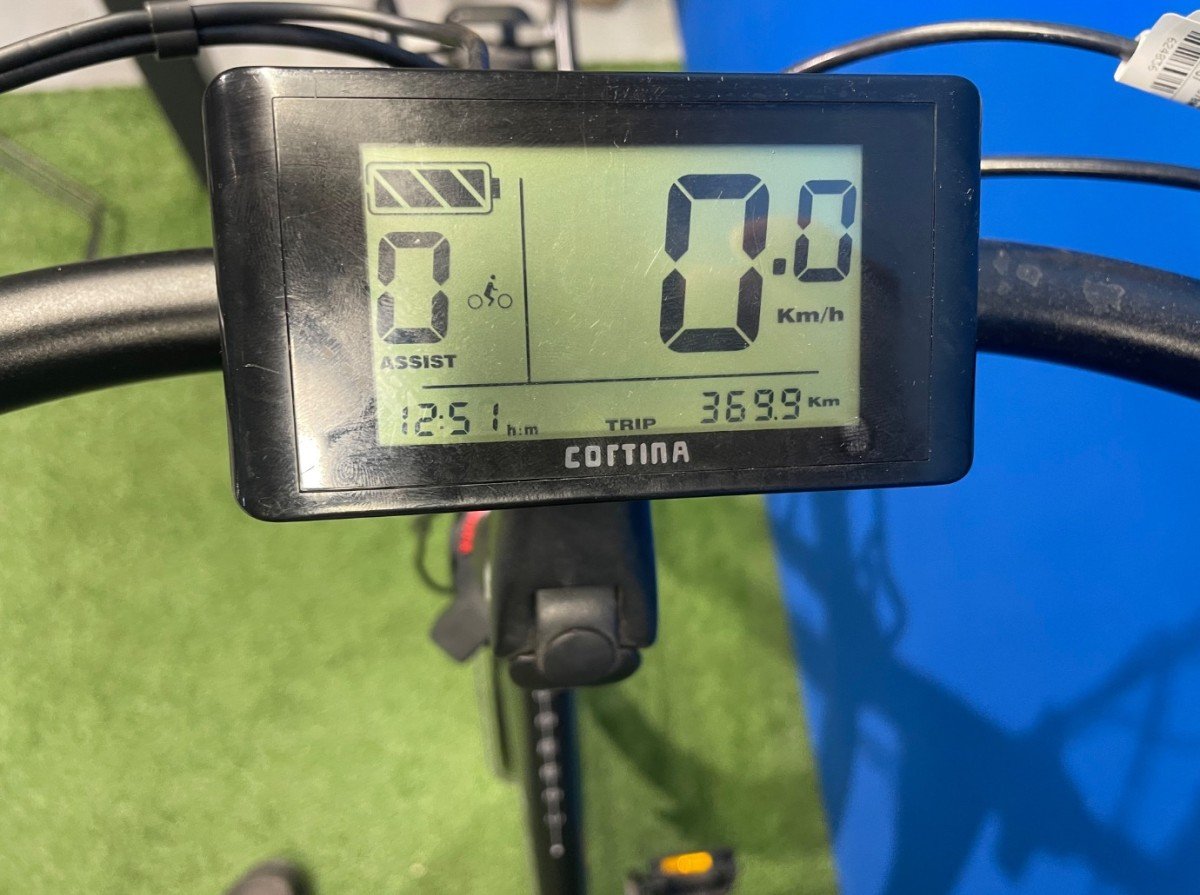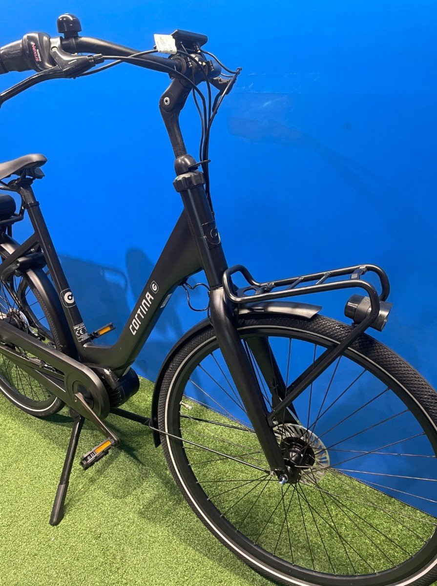 Cortina elektrische fiets Common Dames 57cm, Jet Black Matt, Shimano Nexus 7 versnellingsnaaf , Rollerbrakes voor en achter, Bafang MM300 43V systeem met middenmotor.